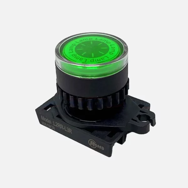 L2RR-L3G Indicador luminoso tipo luz piloto. Para orificio de montaje de 22mm de diámetro. Diseño saliente redondo plano. Color verde. Unidad básica (Cabezal con adaptador), los módulos LED se venden por separado. Grado de protección IP52.