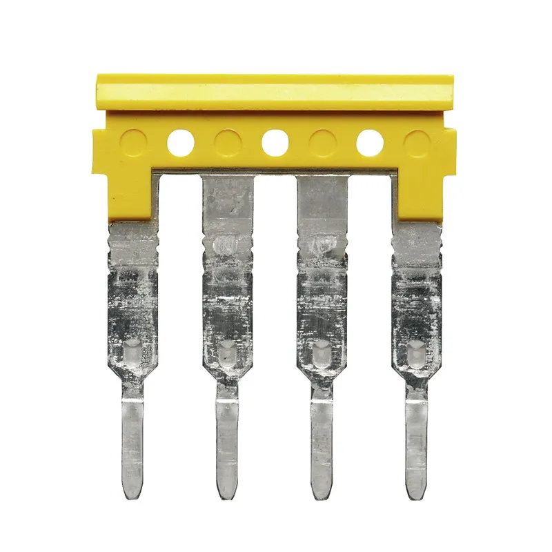 ZQV 2.5N/4 GE Serie A. Puente de conexión transversal enchufable amarillo de 4 polos. Especificado para soportar una corriente nominal de 24A. Indicado para usarse con las clemas A..C/A2T/A3T/ADT/AFS/APGTB con sección nominal de 2.5mm². Diseñado para soportar una temperatura de trabajo de -50 / +120.